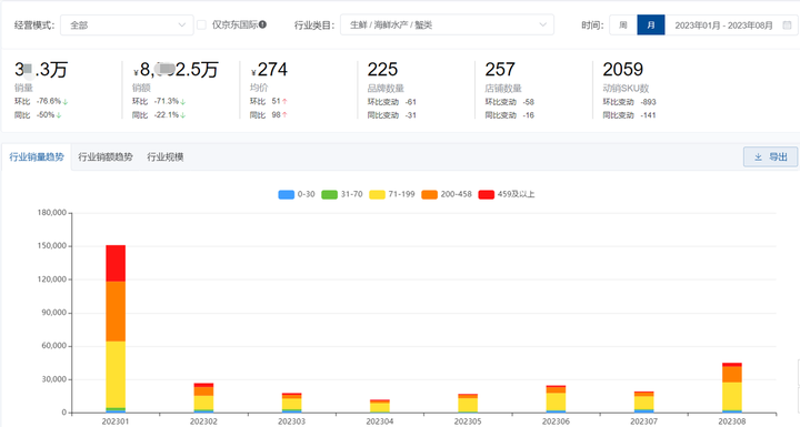 但是从今年长远的发展表现来看, 蟹类线上市场的发展前景不容乐观。根据鲸参谋在京东平台展示的数据统计显示, 今年1月至8月期间, 融合了京东数据平台优势的品牌与店铺数量均有所减少, 同时整体市场价格水平仍然呈现上升趋势, 销量较去年同期下降了50%, 销售额同比下降了22%, 虽然线上渠道展现出一定的增长潜力, 但整体发展态势并不理想