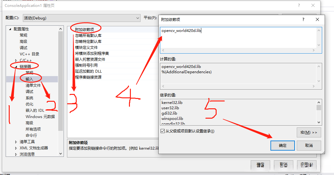 将opencv_world420d.lib文件添加到“附加依赖项”,步骤如图: