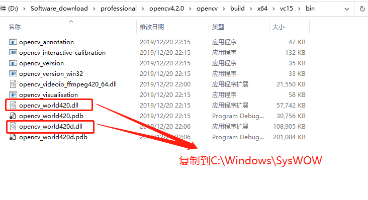 请将Bin目录中的两个opencv_world420.dll和opencv_world420d.dll文件放置于C:\Windows\SysWOW64文件夹内。