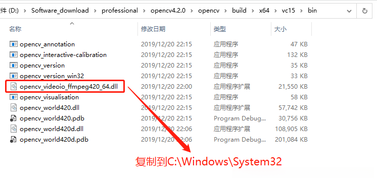 将bin目录下的opencv_ffmpeg341_64.dll复制到C:\Windows\System32文件夹。如图:
