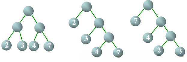 例如,给定4个叶子结点,其权值分别是2,3,4,7,可以构造出形状不同的多个二叉树: