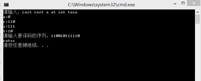 对字符串编码的解码则是将编码串从左到右逐位判别,直到确定一个字符。这可以用生成哈夫曼树的逆过程实现。从根结点开始,根据每一位的值是0还是1确定选择左分支还是右分支——直到到达一个叶子结点,然后再从根结点出发,开始下一个字符的翻译。