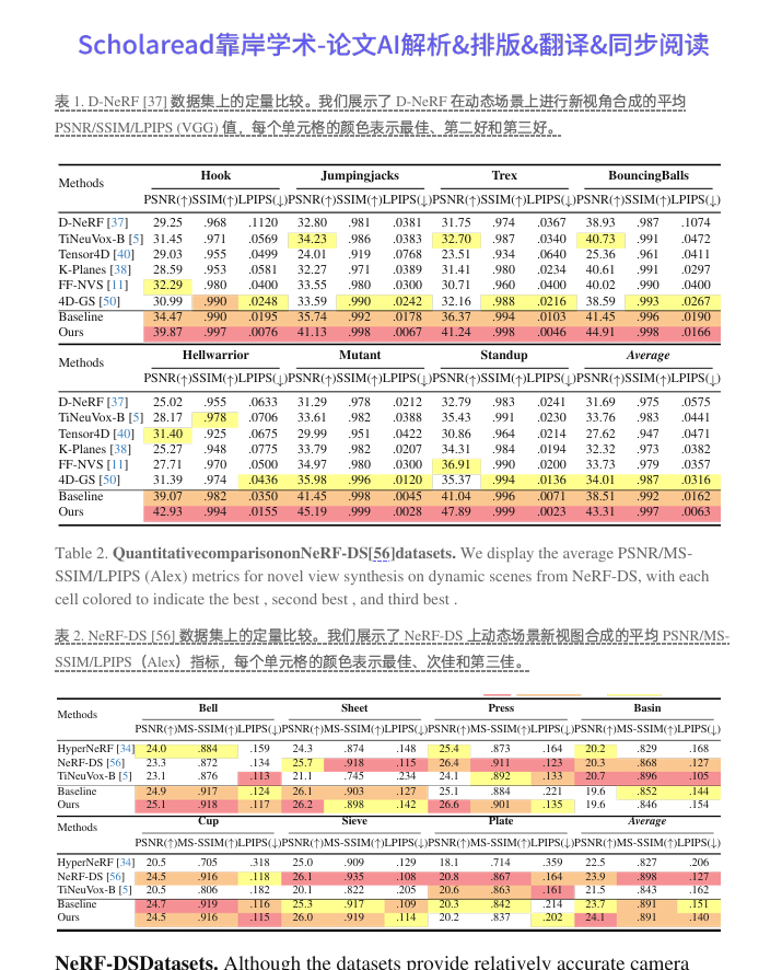 在D-NeRF和NeRF-DS数据集上进行广泛实验,证明了该方法在新视角合成方面的性能优于现有方法。