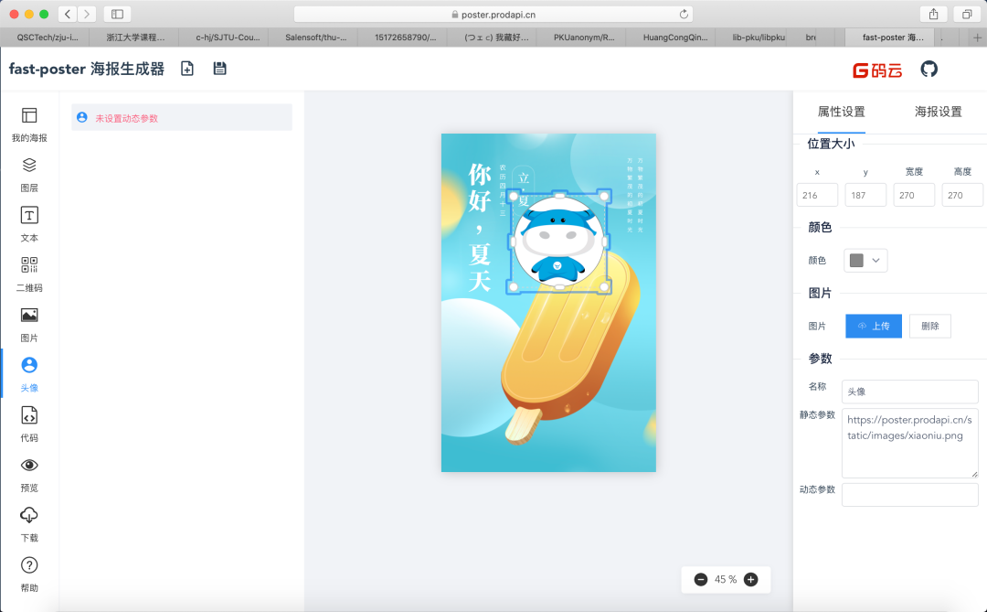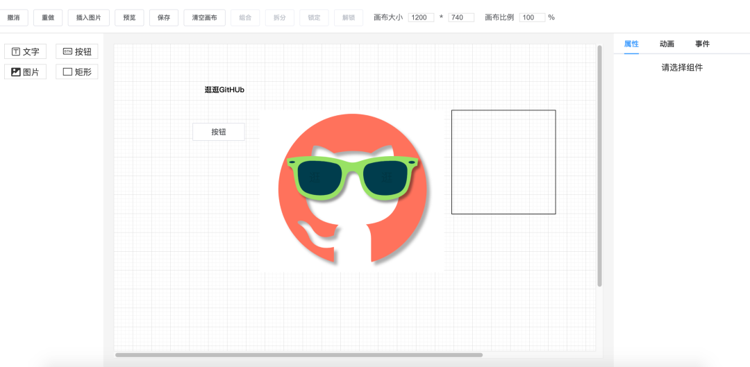 今天推荐的海报编辑器开源项目功能更加完善,最左侧是组件列表。可以在最左侧选择组件,比如文本、二维码、图片等添加到最中间的画布区域,通过右侧的属性调节面板调节添加组件的样式。