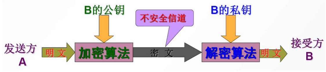 B收到密文后使用自己的私钥对密文解密还原出明文.