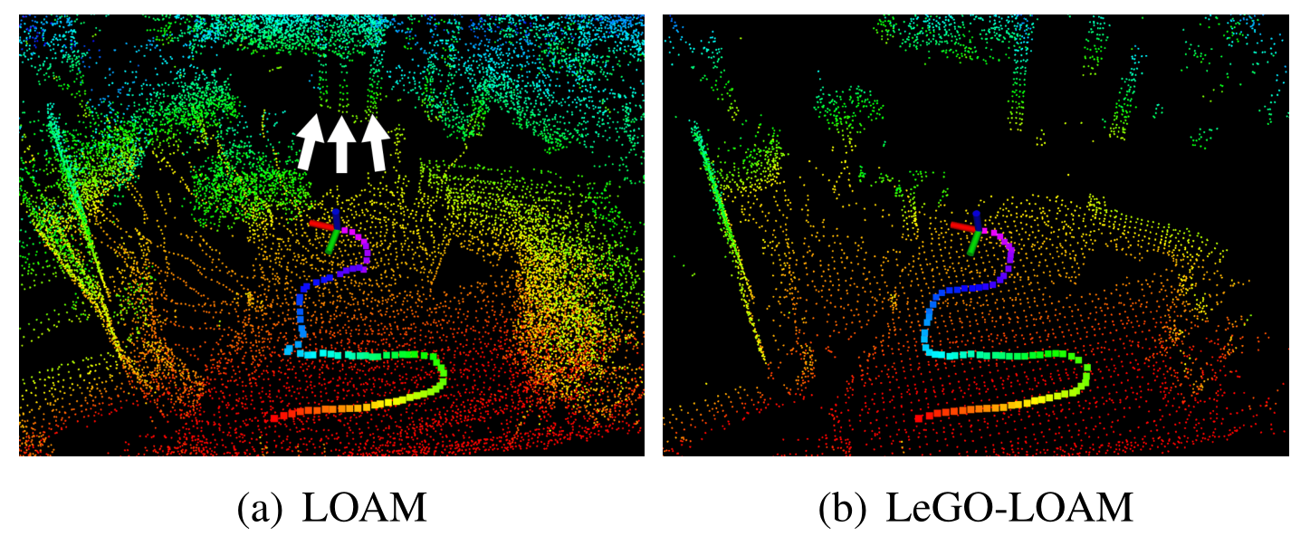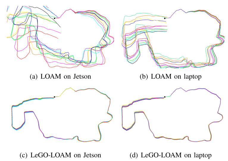 对比: LOAM 和 LeGO-LOAM 在两台计算机上的各个模块运行时间详细列出于表 IV 中。基于所提出的方法,在 LeGO-LOAM 中特征提取和激光雷达测程模块的运行时间降低了量级。请注意这些模块在 LOAM 中 Jetson 上的平均时间为每个均超过 100ms。结果是由于 LOAM 在嵌入式系统上的实时性能无法实现而导致许多扫描被跳过。当采用 LeGO-LOOM 时 激光雷达映射的时间至少减少了 60%