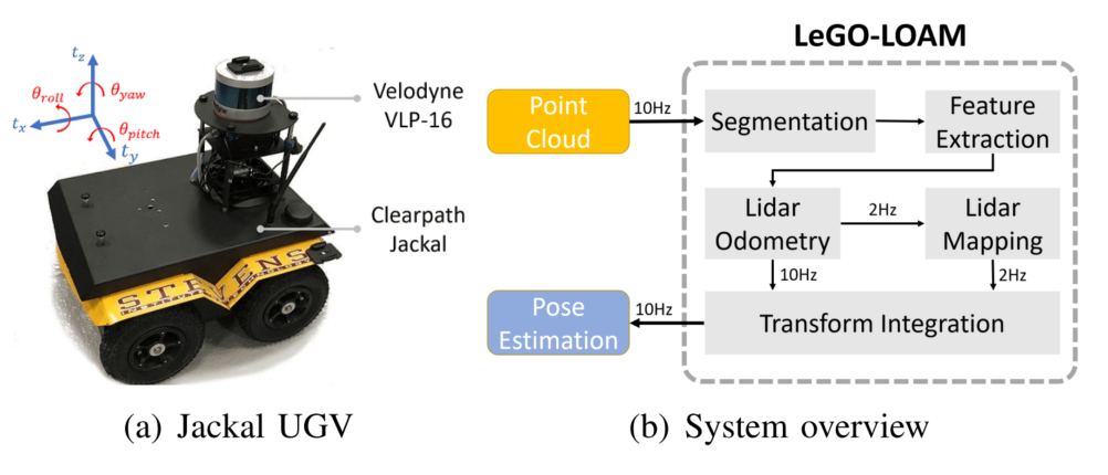 我们开发了LeGO-LOAM这一激光雷达里程测量与映射方法,并对其进行了优化技术集成。该系统旨在实现UGV在复杂环境中的实时姿态估计。首先具备轻量化优势是因为它适合嵌入式系统且能实现实时性能。通过地面优化实现了对地面特征的有效识别与处理。同时剔除了不具价值的关键点以提高数据质量。具体而言采用分步应用改进型L-M算法来分别计算姿态变换的不同分量。为了验证该方法的有效性我们采用一系列室外环境下的UGV数据集作为实验样本进行验证评估。实验结果表明在精度方面LeGO-LOAM表现不俗甚至略胜一筹并且其计算效率较现有技术有明显提升。