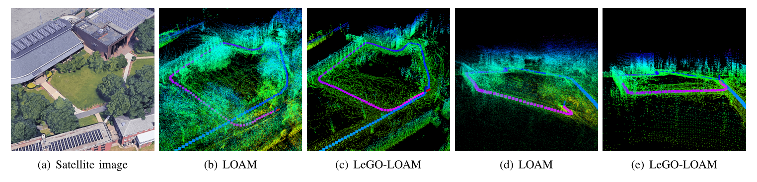 实验1:本实验旨在验证LOAM与LeGO-LOAM均可在城市环境中实现平稳且低漂移的姿态估计。为了确保系统的稳定性,在实验过程中我们尽力避免过激的偏航动作,并尽量避开那些仅凭有限稳定特征可到达的空旷地带。在整个数据采集过程中,机器人主要在平坦的道路表面移动运行。起始位置位于一个斜坡上(见图6(b)),机器人持续以1.35米/秒的速度匀速行驶807秒后返回至初始点