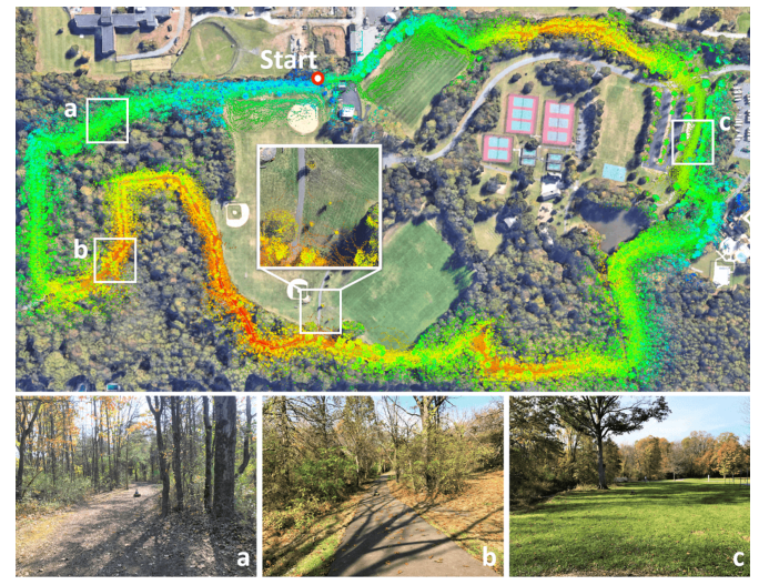 实验3:该数据集源自一片森林中的徒步小径路段。该UGV以每秒一又四分之三米的速度匀速移动。经过约三十五分钟的持续移动后返回起始点。在这片区域中测量的最大高差约为19米。UGV分别在泥土覆盖的小路上、沥青铺就的道路以及被草皮覆盖的地面上移动。这些表面类型的代表性图像均可见于图8底部部分。道路至少一侧始终被树木或灌木覆盖。