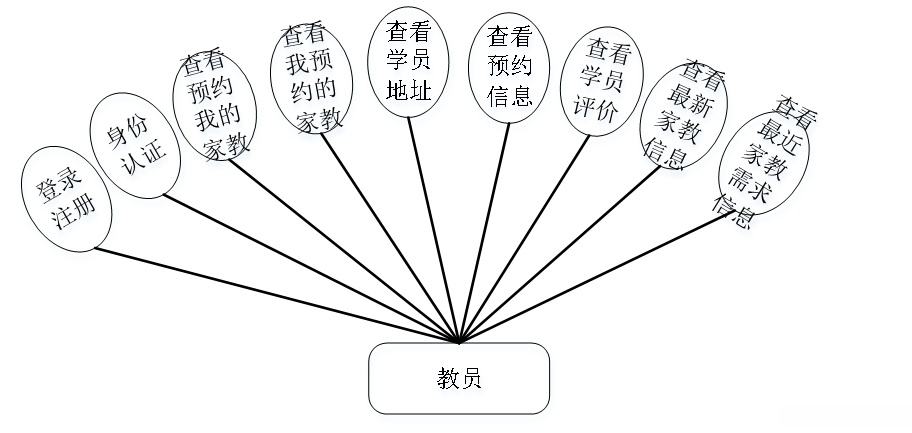 教员可支持简历信息管理、账号登录/注册、身份认证功能,并能查询我的课程安排(包括预约我的家教及他人预约的课程)、学员详细信息(如地址)、课程安排表以及相关评价等数据。系统的用例图见图3.3