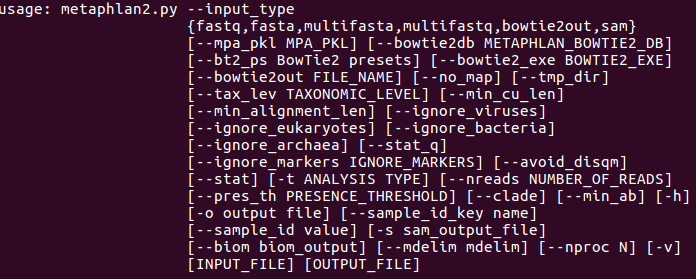 帮助信息:metaphlan2.py -h | less使用上下箭头滚动查看,q退出。