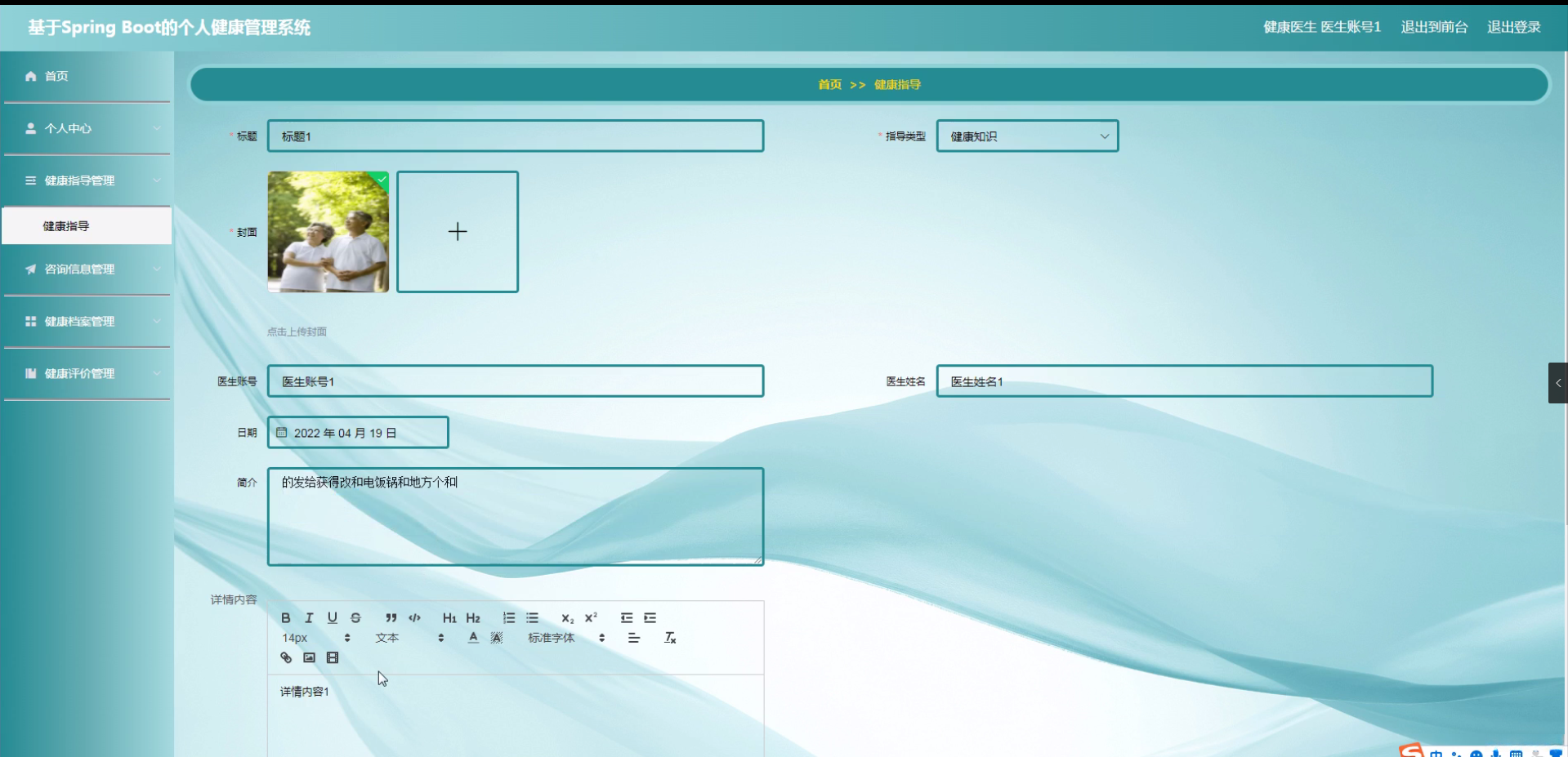 研究意义: 个人健康管理系统的设计与实现可以为用户提供全面、准确、个性化的健康管理服务。通过收集、分析和展示用户的健康数据,该系统可以帮助用户了解自己的健康状况,预防和管理慢性疾病,改善生活方式,提高生活质量。同时,该系统还可以为医生提供便捷的咨询和指导平台,促进医患沟通和合作,提升医疗服务的质量和效率。