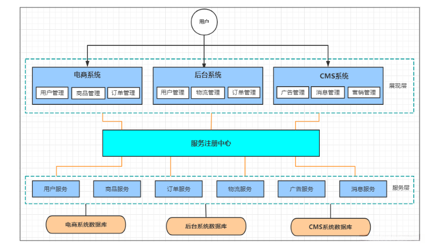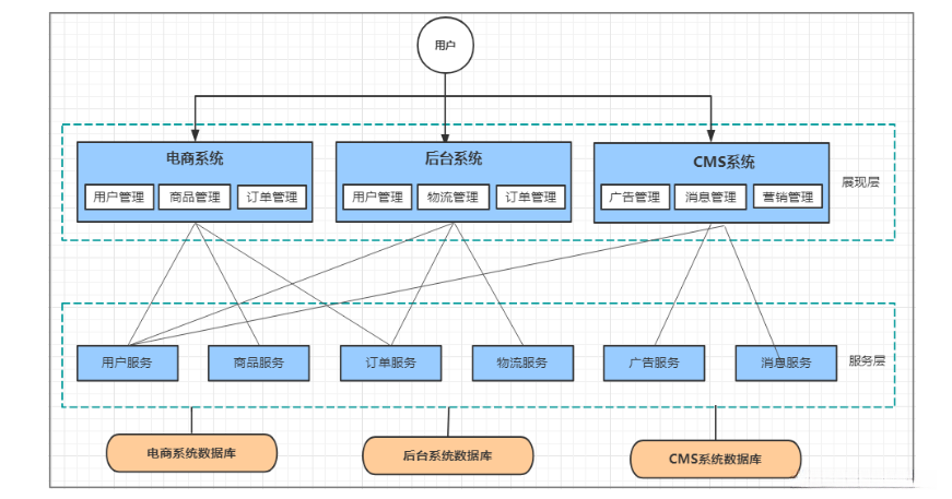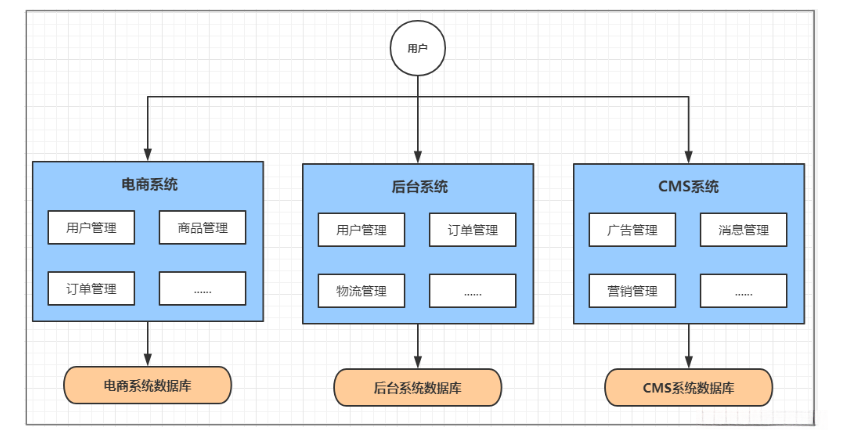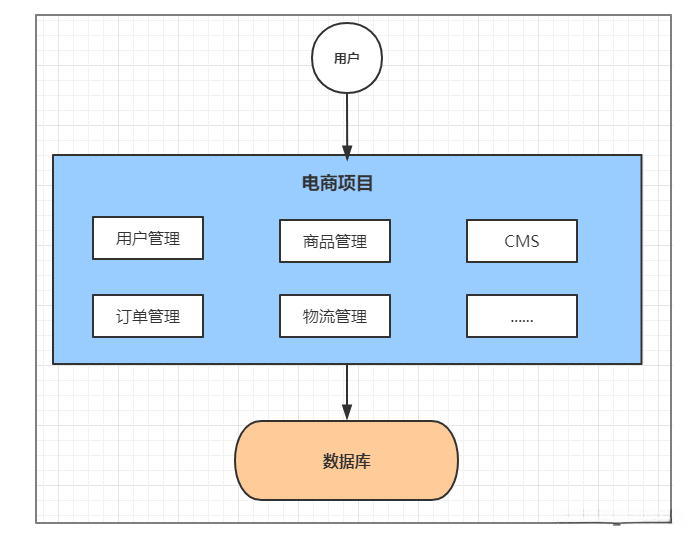 早期的网络环境中,网站的应用流量通常较为有限。因此,在这种情况下即使只有一个功能模块的应用也需要将所有功能代码整合到一个项目中以便能够显著降低开发、部署和维护的资源消耗。例如一个电商系统它会包含多个用户管理系统、商品管理系统、订单管理系统以及物流管理系统等多个功能模块这些都需要整合到同一个Web项目后通过配置好的tomcat服务器实现高效运行。