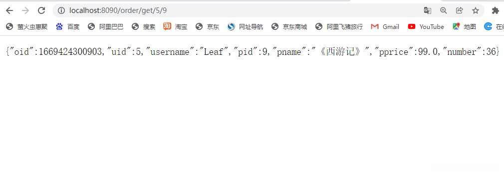 然后我们让三个微服务正常运行,并直接运行该URL地址:http://localhost:8090/order/get/5/9就可以完成任务啦: