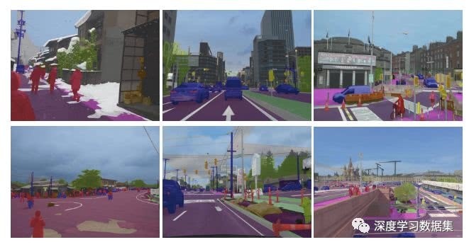 数据集介绍:共包含25,000个高分辨率图像(分为18,000个用于训练,2,000个验证,5,000个测试;平均分辨率约为900万像素),具有从200万个手动绘制的多边形的像素点注释;100个对象类别,其中60个实例特定(即枚举对象);涵盖北美和南美,欧洲,非洲,亚洲和大洋洲的全球地理覆盖;天气条件(太阳,雨,雪,雾,阴霾)和捕获时间(黎明,白天,黄昏甚至夜晚)的高度变异性;相机传感器范围广泛,焦距变化,图像宽高比以及不同类型的相机噪音;不同的拍摄观点(从道路,人行道和越野)。