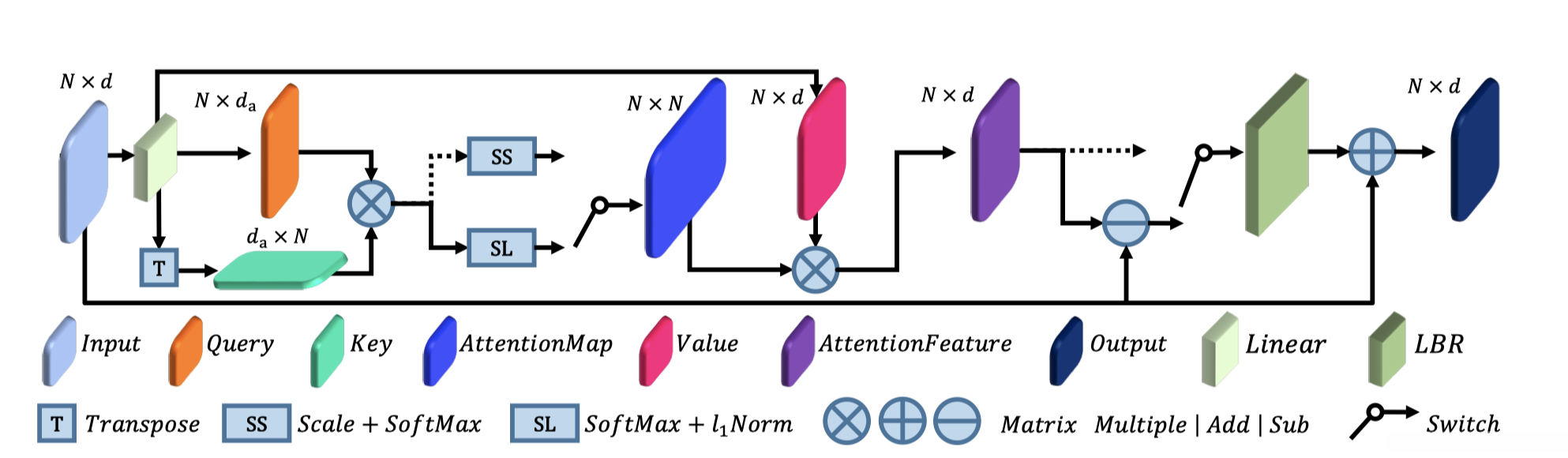 我们对第一维度应用了 softmax 操作,并在第二维度施加了 l_1-范数进行归一化处理。传统 transformer模型通过缩放操作将第一维度的特征按比例调整为 \frac{1}{\sqrt{d_a}} 的大小,并对该维度的所有元素应用 softmax 函数完成第二维度的归一化。