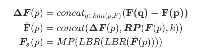 例如,在SG层中假设我们采用一个包含N个顶点及其对应特征F的点云P作为输入,并生成一个包含N_s个顶点及其对应的聚合特征F_s的采样点云P_s。接着,在每个采样顶点p\in{P_s}处定义其最近邻区域knn(p,P),随后通过计算得到输出特征\bf{F_s}: