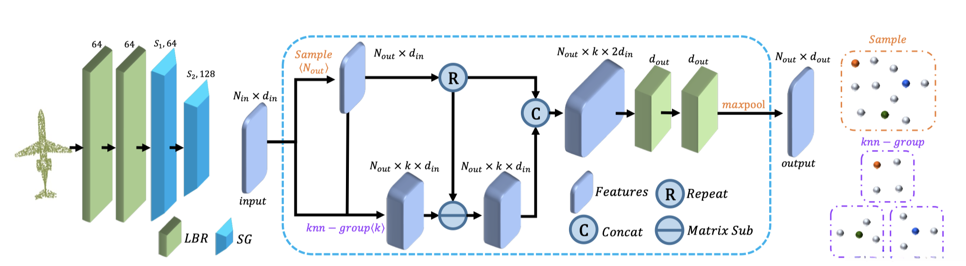 由 SG 模块组成,并包含 N 个输入采样点、D 个输入通道、K 个邻居节点、N_{out} 输出采样点以及 D_{out} 输出通道。