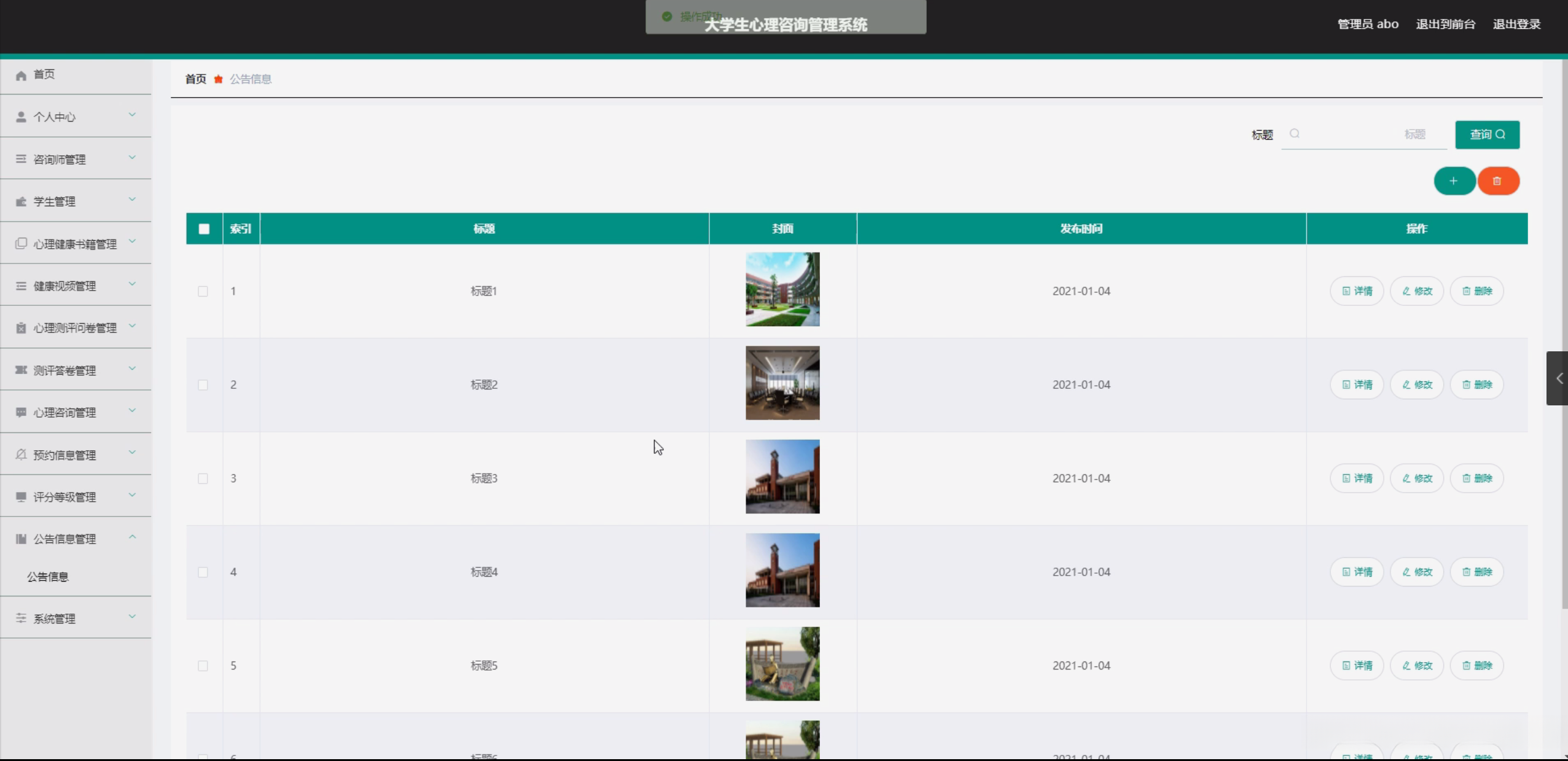 本研究内容将围绕大学生心理咨询管理系统的核心功能展开,包括咨询师管理模块(实现咨询师的注册、登录、个人信息管理、咨询排班等功能)、学生服务模块(提供学生注册、登录、个人信息管理、预约咨询、查看心理测评结果等功能)、心理健康资源管理模块(提供心理健康书籍、健康视频等资源的上传、下载、分享等功能)、心理测评问卷管理模块(实现测评问卷的创建、发布、答卷收集、结果分析等功能)、心理咨询管理模块(实现咨询预约、咨询记录、评分评价等功能)以及公告信息管理模块(发布系统公告、心理咨询动态等信息)。通过构建和优化这些功能模块,旨在实现大学生心理咨询管理的全面覆盖和高效运作。