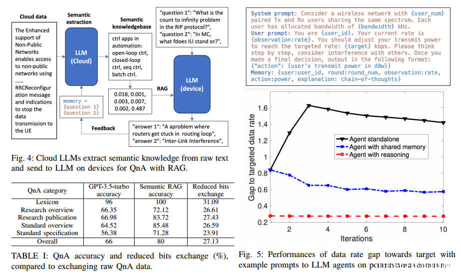 表1的实验结果表明,与基础的Llama-7B模型相比,语义KB显著提升了TeleQnA在所有分类任务上的准确率。与基于云的QnA方案相比,系统在交换信息量上减少了27%。实验案例表明,LLM能够通过语义知识提取辅助完成特定任务,这一机制相较于直接发送原始数据具有更高的效率。