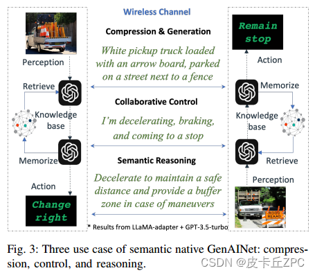 图3展示了自动驾驶汽车之间通过GenAINet协议进行通信的示例。其中,自动驾驶汽车中的代理利用LLM不仅作为知识检索器和发送者,还承担决策者的角色。这种通信模式既包括知识检索功能,也包含与远程代理共享信息的一部分,远程代理通过分析推理路径中的操作和观察结果来制定计划。这不仅提高了信息交换的效率,还增强了决策的可靠性。检索器通过整合本地和远程知识库的信息,并将其传递给参与者,从而生成有效的驱动指令。行动者则根据环境反馈不断优化推理路径,例如,LLM可以对CoT(基于类比推理)的性能进行奖励优化,以找到最佳路径和行动方案。完成任务后,代理会从最近的计划中提取知识(例如,学习规则),并将这些知识存储在内存中,为后续任务提供支持。此外,我们还展示了三种典型的语义通信场景。第一种是多模态感官数据的语义压缩,LLM能够在源文本数据上提取语义潜,实现无损生成[12]。通过使用多模态LLM,语义压缩技术能够有效整合来自不同视场或分辨率的遥感数据,从而提升下游任务的性能,例如事故检测和导航。第二种是协作知识共享,其中代理通过远程检索功能实现抽象概念的交换。具体而言,代理会对来自远程代理的请求执行语义相似性搜索,并将相关信息反馈给参与者。第三种是语义推理场景,其中代理通过分析过去行为的后果来实现与他人的信息交换。这不仅能够减少智能体的推理延迟,还能提高决策的可靠性。值得注意的是,长期的知识信息相较于短期经验具有更高的世代性,因此在信息传递过程中能够有效降低通信成本。