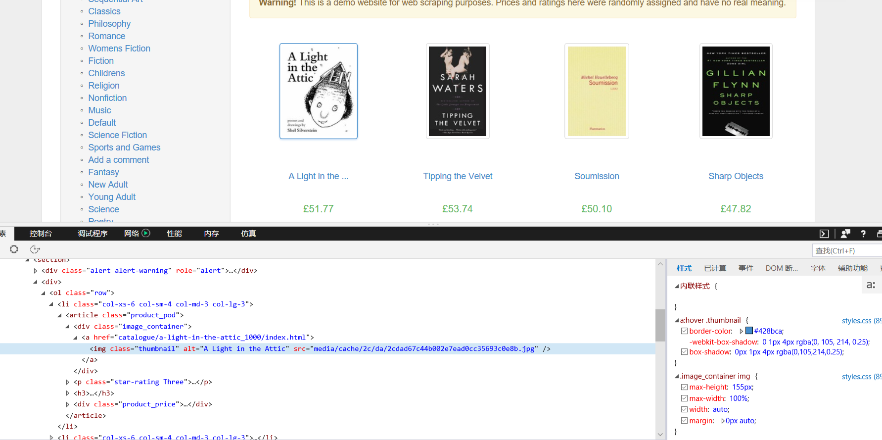 分析完书籍页面后,接着分析如何在书籍列表页面中提取每一本书籍页面的链接。在scrapy shell中,先调用fetch函数下载第一个书籍列表页面(http://books.toscrape.com/),下载完后再调用view函数在浏览器中查看页面。