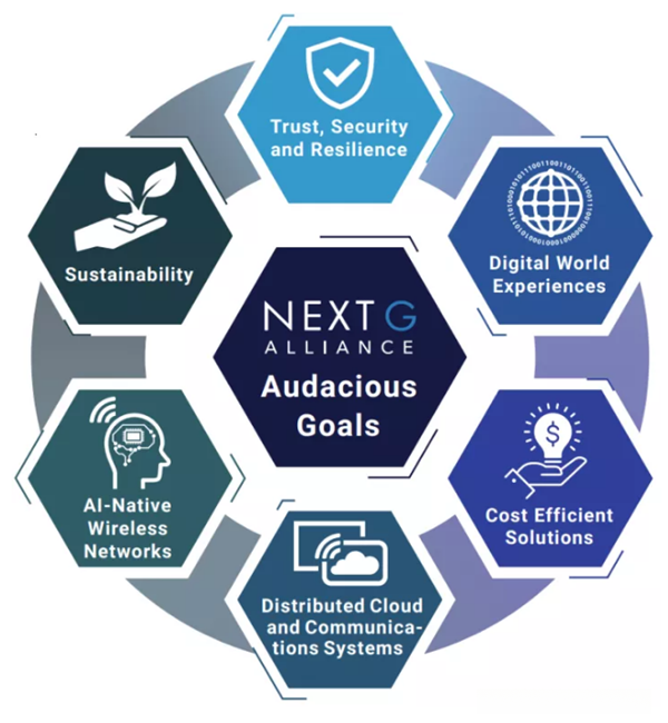 到本世纪末,在从研究到商业化这一完整周期内(参见图1),北美将在多个行业、政府机构与学术界之间建立更加紧密的合作关系;同时构建一个强大的生态系统(Ecosystem),通过创新的应用程序与技术实现社会数字化转型;最后实现对先进技术和设备所有权的全面掌控并推动6G愿景的达成。北美6G联盟已制定了六个关键方向(参考图2),这些方向聚焦于未来全球标准制定、技术部署优化、产品创新、运营效率提升以及服务保障能力建设等最优先关注的领域。这些核心方向均综合考量了整个北美地区的社会发展需求以及该地区在全球范围内的技术竞争优势