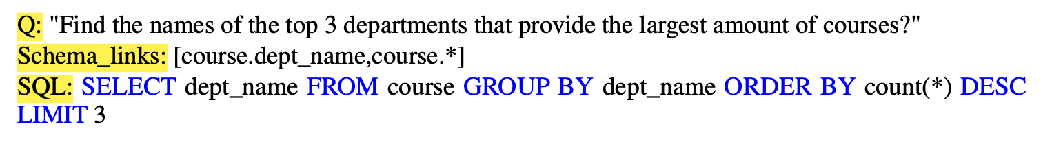 非嵌套复杂类别:遵循格式 < Qj,Sj,Ij,Aj > ,其中 Sj 和 Ij 分别表示第j个示例的schema links和中间表示。其中中间表示使用NatSQL,删去了集合运算符。