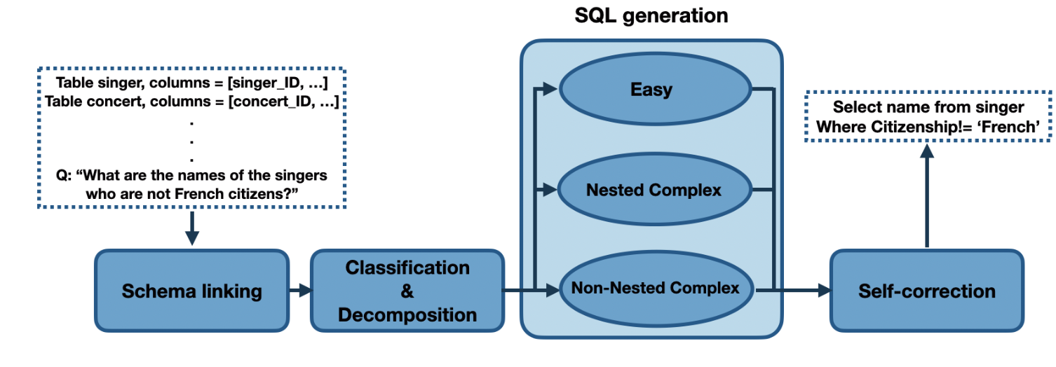 如上图四个模块为:(1) schema linking, (2) query classification and decomposition, (3) SQL generation, (4) self-correction