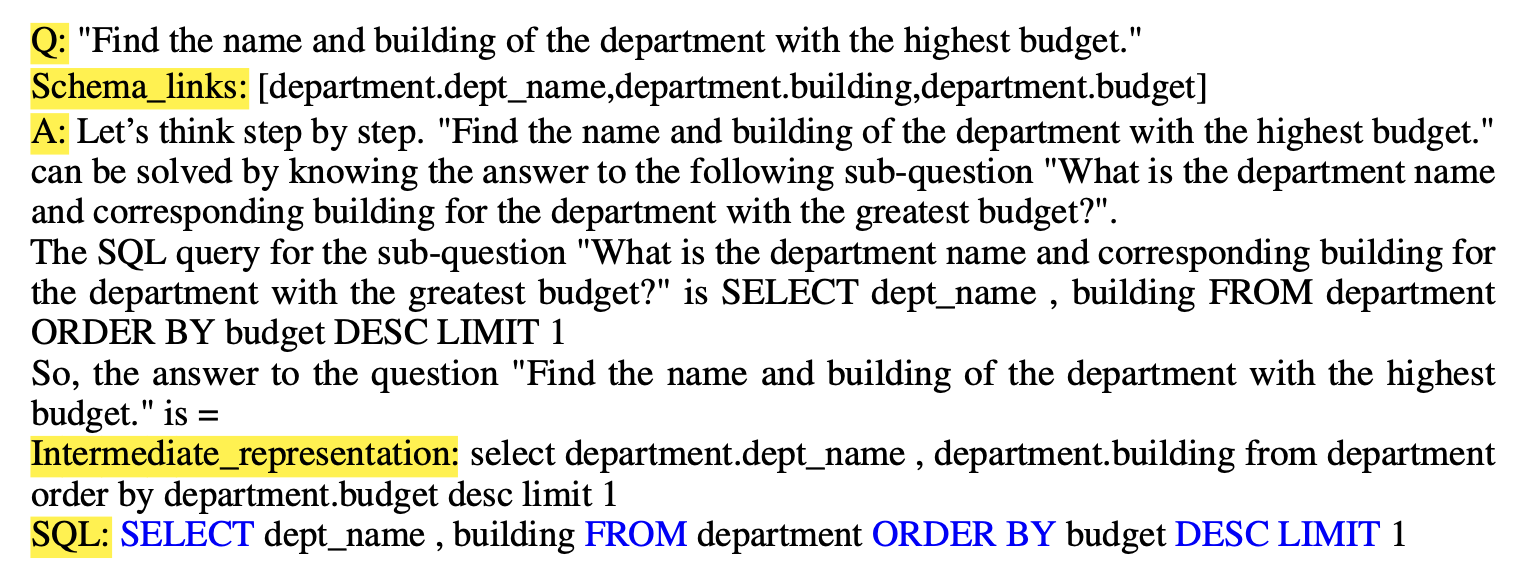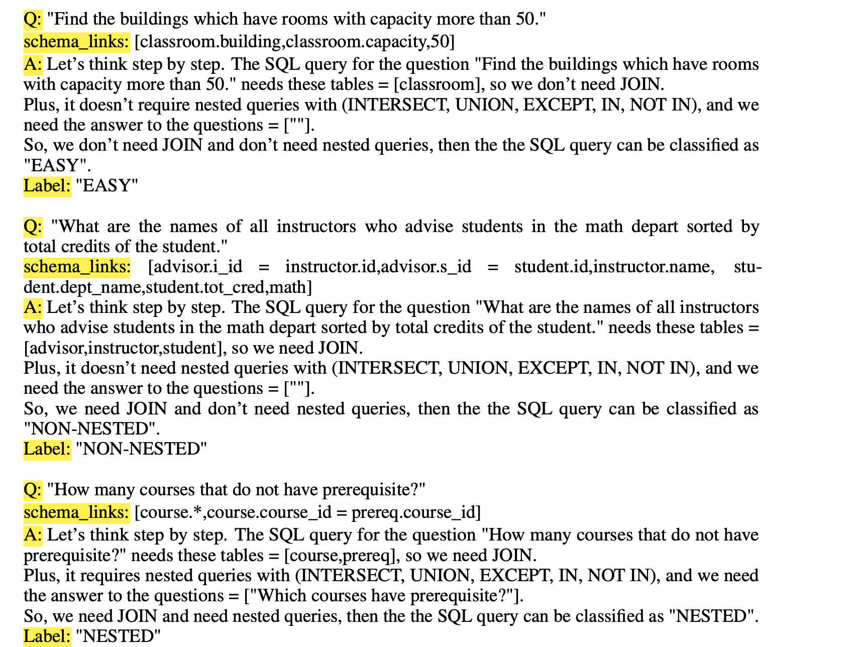 嵌套复杂类别:提示符遵循 < Qj,Sj,< Qj1,Aj1,... ,Qjk,Ajk > ,Ij,Aj > 的格式,其中,Qji 和 Aji 分别表示第 i 个子问题和第 i 个子查询。和前面一样,Qj 和 Aj 分别用英语和 SQL 表示查询,Sj 给出schema links,Ij 是中间表示(也是NatSQL)。