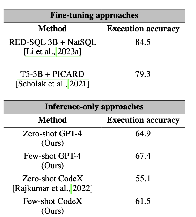 在zero-shot和few-shot下的大模型已经有了足够好的结果,但这些模型在常用的基准测试(比如spider上)仍然落后于设计良好的经过微调的模型,如下图: