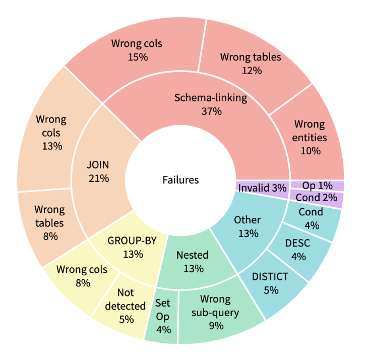 随机在spider数据集的训练集中的不同数据库中抽取了500个查询,来解释LLM在少数情况下的失败之处。本文手动检查了这些失败,并将其分为六种。