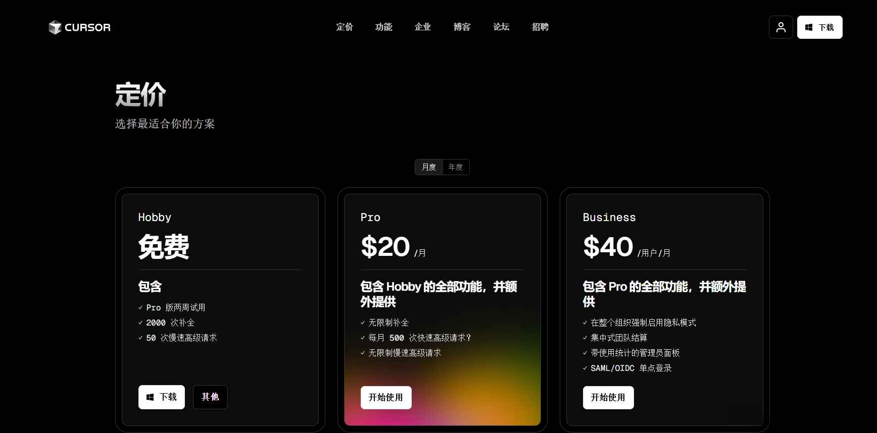 然后就是价格,cursor 前两周是免费使用的,然后再用就要收费了,怎么收费呢?