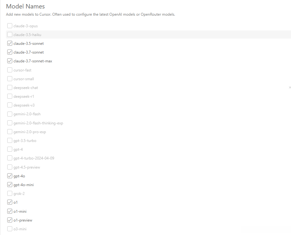 cursor 的逻辑是,先将工程内的所有代码进行索引和向量化(Embedding),再之后你的所有提问都是基于整个工程给你答案,它会将你的提问结合整个工程的代码一起提交给 LLM,默认有这些模型: