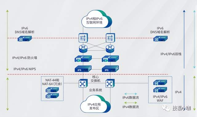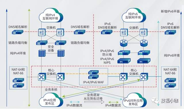 该改造方案对现有IPv4网络架构不做任何修改,并且不会对现有业务造成影响。当业务系统完成双栈改造后,整个网络架构的改造也随之完成。