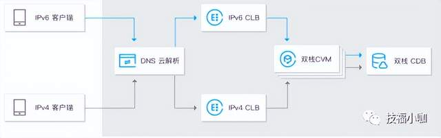 在众多应用场景中(特别是针对云端的应用场景),都需要具备云解析DNS的支持以实现IPv6格式的网站域名解析功能。此外,在负载均衡方面(例如通过CLB),系统能够实现IPv4与IPv6流量的高效转发及平衡分配。同时,在后端服务器(如CVM)以及云端数据库之间均需要建立双栈架构以确保兼容性与稳定性。此外还可以部署CDN以加速静态内容的分发