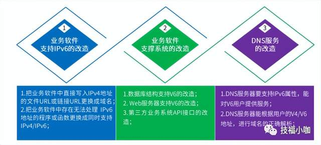 | 3 | 业务系统改造 | 1. 数据库系统支持IPv6 2. Web中间件系统启用IPv6 3. CMS系统支持IPv6 4. DNS启用AAAA记录 5. Web防护系统启用IPv6 日志统计系统启用IPv6 | 1. 很老的数据库可能需要升级 2. 老Web中间件可能需要升级 3. 老CMS系统可能需要升级,WordPressCMS系统需更换。 4. DNS域名解析支持AAAA记录;如使用ZDNS需启用高级功能。 5. Web防护系统可能需要升级。 6. 日志统计系统升级。 |