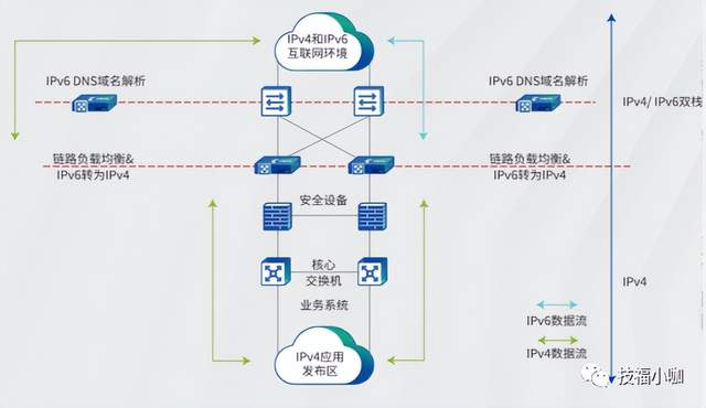 这段改造方案仅需出口设备与负载均衡设备同时支持运行IPv4和 IPv6 协议即可实施;其中,在负载均衡设备下负责的相关网络设施、安全设备以及业务系统均无需做任何改动或优化。