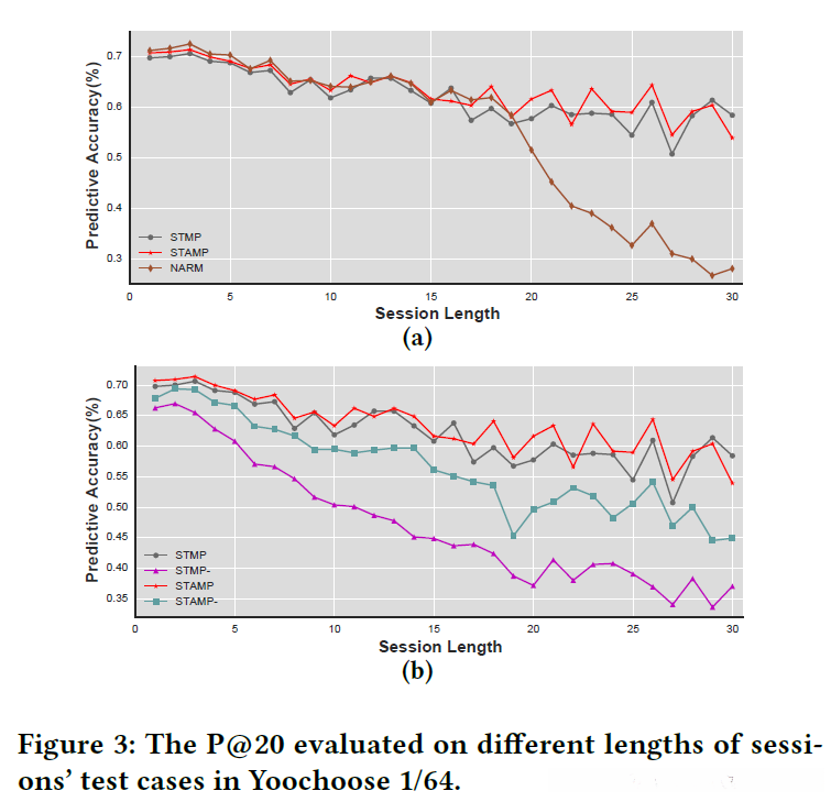 我们首先展示了改变STMP、STAMP以及NARM系统中会话长度的实验结果(如图3(a)所示)。通过分析图中数据可以看出,在会话长度超过20的情况下NARM系统的表现明显低于STMP与STAMP系统。这一现象提示我们,在处理较长对话时短期利益导向模型较之于NARM系统展现出更为强大的能力表现。另一方面观察图3(b)发现,在1至30长度区间内STMP与STAMP系统的P@20指标均显著优于各自对应的模型参数设置(其中未将最后一次点击输入到三线性层)。这一结果的原因在于当我们在最后一次点击或对话终止标记中捕获当前兴趣后 STMP与STAMP系统能够更加有效地基于此建立用户的兴趣模型从而为后续点击提供更有针对性的内容推荐这种机制使得其在对话式推荐任务中的性能表现更为出色。进一步研究表明对于较长对话而言 STMP-与STMP之间的性能差距以及STAMP-与STAMP之间的性能差距相较于原始版本将显著扩大这表明虽然从对话内容中提取出通用兴趣具有重要意义但明确利用临时兴趣信息能够显著提升推荐质量由此可见 最终点击信息在对话式推荐任务中的重要性。