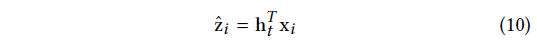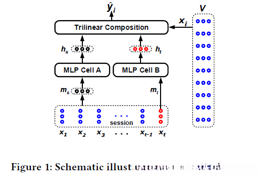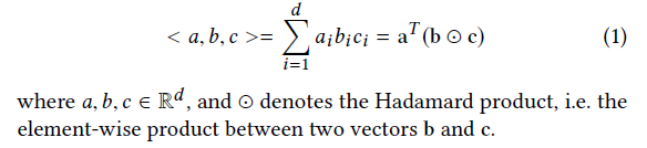 令X = \{x_1, x_2,...,x_{|V |}\}表示关于项目字典 V 的嵌入向量。STMAP模型对 V 中的每一个项目 i 学习一个d维实值嵌入x_i \in \mathbb{R}^{^{d}}。其中,符号x_t \in \mathbb{R}^{^{d}}表示嵌入当前会话前缀s_t的最后一次点击S_t。我们的模型的目标是预测下一个可能的点击(即s_{t+1})基于给定的会话前缀s_{t}。确切地说,我们的模型构造和训练一个分类器去对项目字典V里每一个候选项学习生成一个得分,令\hat{y } =\{\hat{y}_1, \hat{y}_2 ,..., \hat{y}_{|V|}\}表示得分向量,其中\hat{y }_i表示项目v_i的得分。在得到预测结果后,\hat{y } 里的元素按降序排名,相对应的物品topk分数用于推荐。为了表述方便,我们将三个向量的三线性积定义为: