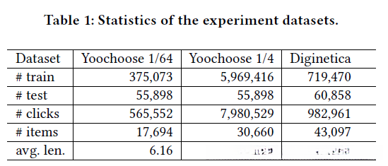 在两个数据集中进行评估以验证我们提出的模型性能表现,在这个研究中我们主要采用了两个不同的公开可用的数据集来进行实验研究。第一个实验采用的数据集名为Yoochoose该集合源自RecSys组织在第十五届推荐系统大赛(RecSys Challenge 1)中发布的相关竞赛任务其涵盖了从电子商务网站收集来的六个月内的一系列商品点击流数据其中训练样本仅限于记录单个用户的购物车活动情况。第二个实验则采用了源自CIKM Cup 20162比赛中的Diginetica dataset该集合在本次研究中仅提取并使用了与交易相关的具体信息作为实验分析的基础
