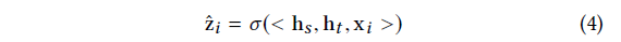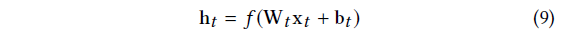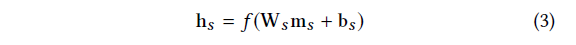 其中h_s \in \mathbb{R}^{^{d}}表示输出状态,W_s \in \mathbb{R}^{^{d\times d}}为加权矩阵,b_s \in \mathbb{R}^{^{d}}为偏置向量。f(\bullet ·)是一个非线性激活函数(我们在本研究中使用tanh)。状态向量h_t关于m_t的计算方法与h_s类似。对于给定的候选项x_i \in V,其得分函数定义为: