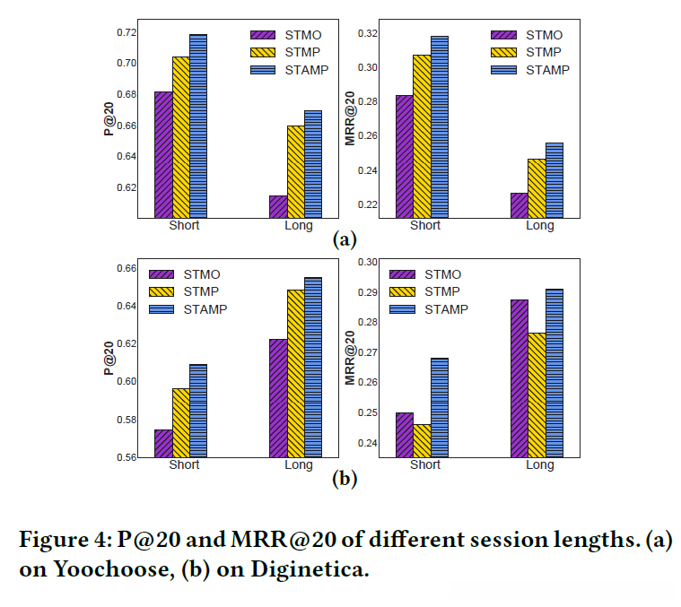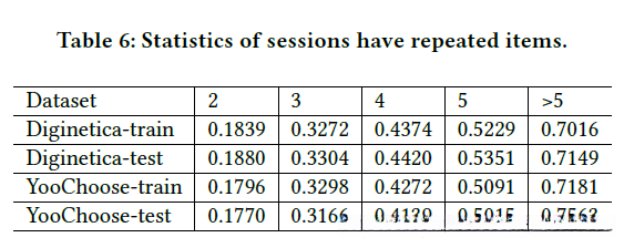 此外,请参考图4所示的数据对比结果表明,在Yoochoose和Diginetica两个数据集中呈现出显著的趋势差异性。为了解释这一现象差异性,请对这两个数据集进行深入分析,并展示出重复点击事件在对话中的占比情况。就对话时长而言(即每次至少被点击两次),在这两个数据集中均存在较高的重复点击频率特征表现出来)。根据表6的数据统计结果发现,在Yoochoose的数据集中较短对话中的重复点击比例较低,在较长对话中则较高程度地呈现出了这种特征表现出来)。从上述研究结果可以看出,在对话过程中出现多次点击的现象会对推荐效果产生显著影响(两者之间呈反比关系)。具体而言,在这种情况下推荐系统可能会过度强调不重要的条目信息而导致无效内容的影响;从而使得系统难以有效捕捉到用户后续的操作兴趣点信息)。基于此观察结果,在STAMP模型中我们采用了一种新的短期注意机制设计思路:即通过动态调整当前用户的兴趣关注范围来实现对对话过程中的重要项目选择;从而有效缓解对话中断断续续的问题(相较于现有方法而言)。这种方法不仅能够更好地平衡短期记忆与长期记忆之间的关系;而且也能够提升整体系统的推荐性能表现出来)。因此该研究工作证明了这种基于短期注意优先级的设计方案具有较高的理论价值和实践意义