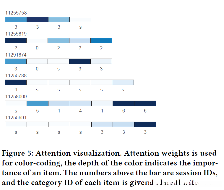 在图5中,颜色深度与项目重要性呈正相关关系,在缺少具体项目信息时难以直接量化各上下文项目与目标项目的关联度因此可从项目类别角度部分解析注意力机制的有效性如在会话11255991中我们观察到具有相同类别特征的目标项目较其他类别的项目具有更高的注意权重这一差异表明不同类别间的关联程度可能会影响到注意力机制的效果不同类别的项目权重差异可能间接反映出用户对这些项目的兴趣程度从而为后续行动提供支持