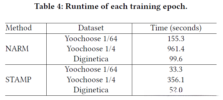我们不仅记录了递归神经模型NARM的运行时间,还评估了我们提出的方法STAMP的表现。为了确保公平性,在实现这两个模型时我们使用了相同的100维嵌入向量,并在同一台GPU服务器上进行了测试。表4展示了三个数据集上每一轮训练的时间消耗情况,在此过程中我们可以清晰地看到STAMP方法比NARM更加高效。进一步分析表明,在NARM模型中每个GRU单元都需要执行大量复杂的操作,在这种情况下尽管模型架构更为复杂但计算效率却相对较低相反我们的STAMP方法通过引入了一个更为简洁高效的神经网络架构成功降低了处理顺序输入时所带来的重复计算开销因此在实际应用中这种方法能够显著提升系统的运行效率
