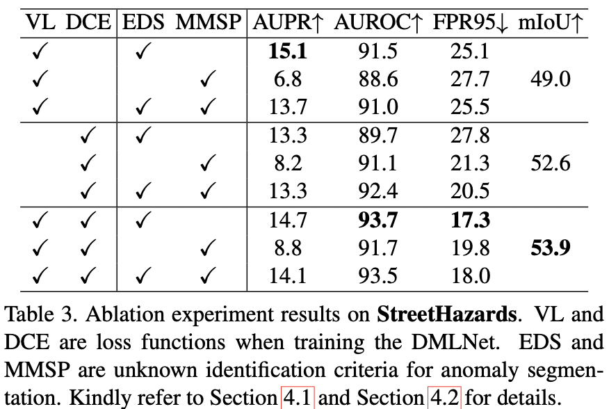 - 无论是在何种损失函数的情况下, EDS 总是能够展现出比 MMSP 更佳的表现效果; 这进一步验证了与类无关的标准在异常分割任务中更为适用。