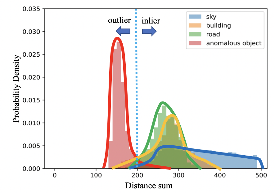 EDS 代表所有像素间最大距离和的比例,在不含有OOD对象的情况下,在每幅图像中都必然存在高异常分数区域。此外,在同一类别内部各点间的总距离分布彼此略有差异(见图4)。