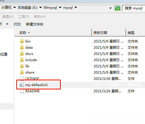 5.5以前版本安装后会自动建有my.ini配置文件,5.7后就需要手工创建,有些名字叫my.ini,高的版本my-default.ini ,我这版本5.7.34,打开一个记事本,复制下面代码另存为my-default.ini即可