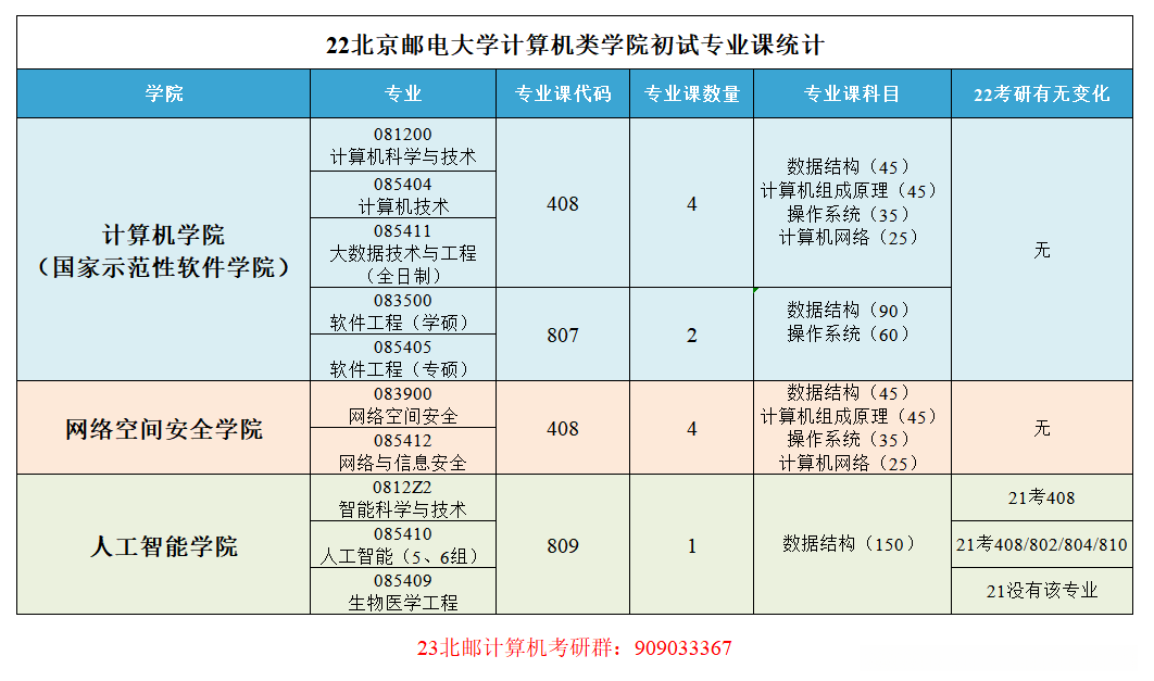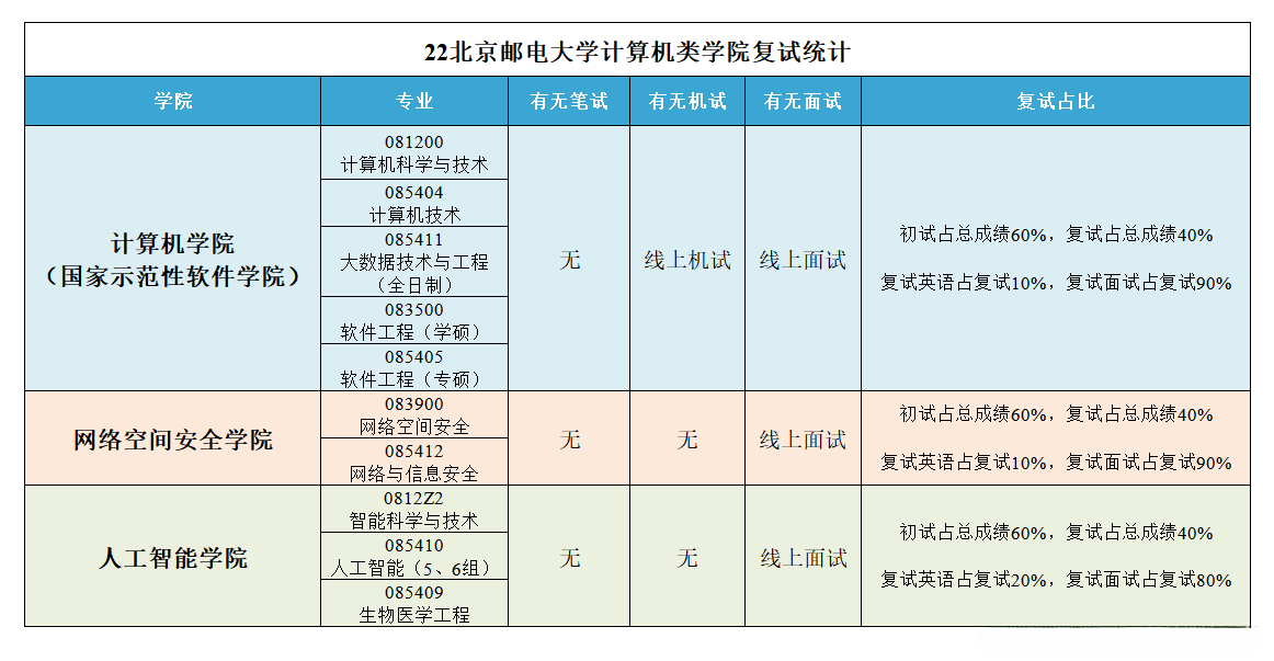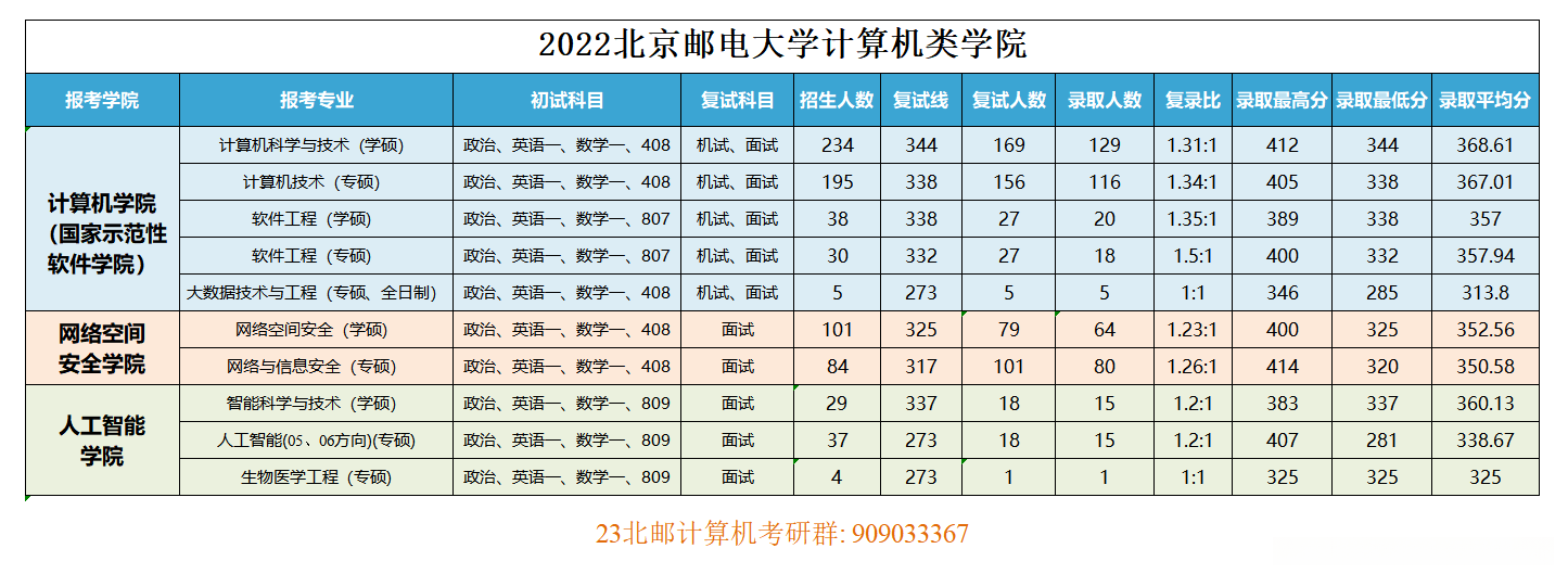 北邮计算机类学院有三个,分别为:计算机学院(国家示范性软件学院)、网络空间安全学院、人工智能学院。不同学院的专业课、招生人数、报考人数、录取平均分差别巨大!