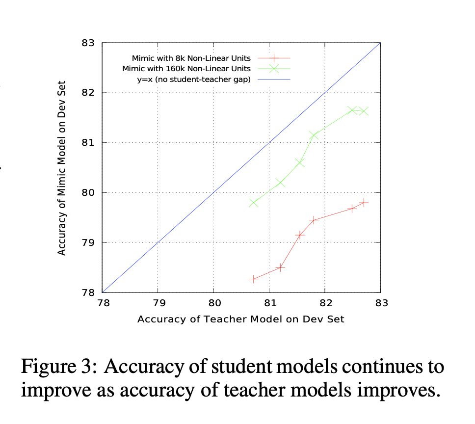 - 学生模型不会运行比老师更好。虽然尺寸不同,两个模型之间以及与老师模型之间存在一致的性能差距,较小的浅模型最终能够通过向更好的教师学习而获得与较大的浅网相当的性能,并且两种模型的准确性仍在继续随着教师准确度的提高而增高.
